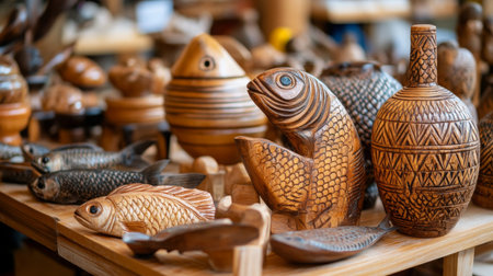 Handcrafted Wooden Fish and Pottery Displayed at Artisan Market in Early Morning Light