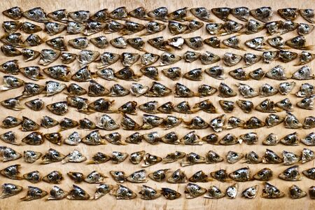 Close-up of fish drying on ropes strung along the coast, with the ocean horizon in the distance