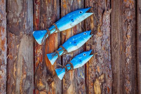 Three wooden decorative fish tied with twine. Interior items in country style. Creating comfort through small details in the design. Symbol of summer holidays at sea, fishermen, life on the coast.
