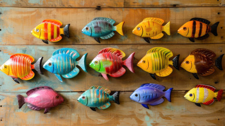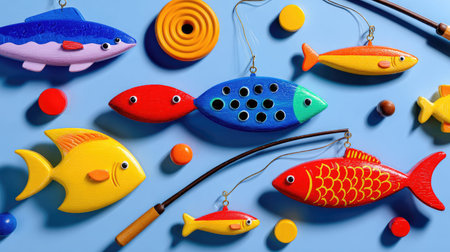 Discover a vibrant collection of colorful wooden fishing toys and playful decorative elements, perfect for imaginative play and educational experiences for children.