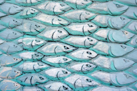 A shoal of fish carved in plaster on a wall and painted with tones of blue, green and turquoise.