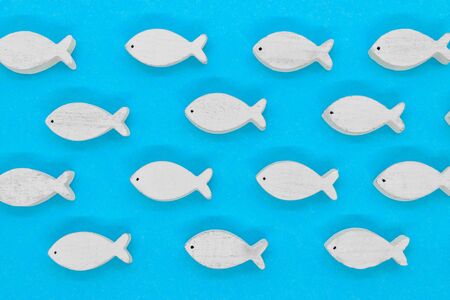 Abstract background of very old white and grunge white fishes on soft blue matte background