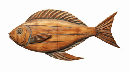 a wooden fish figure, reminiscent of luxurious wall hangings, stands on a white background. with sharp lines and edges, this tropical symbol exudes a precisionist aesthetic. its rough hewn surfaces add a touch of massurrealism, while smooth and curved lines create an intriguing contrast. ai generated