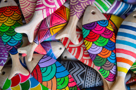 Handmade colored wooden toy in the form of fish for sale at street souvenir market
