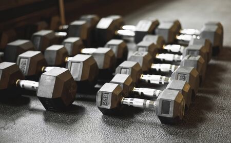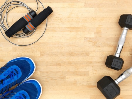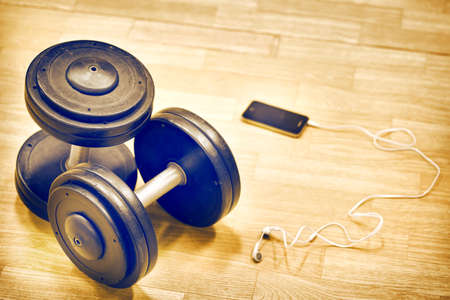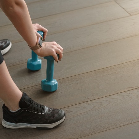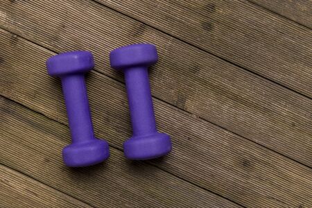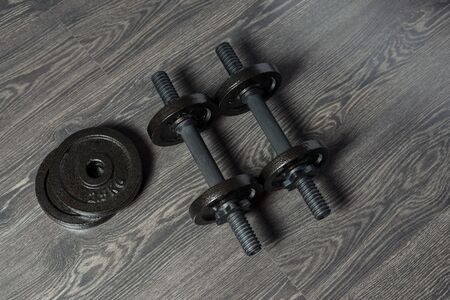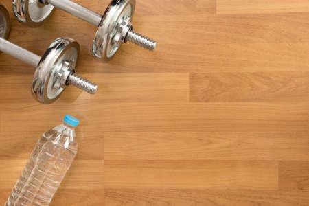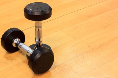 Training at home fitness concept: dumbbell weights on wood floor at fitness gym . Weight loss and health. Sport fit lifestyle.