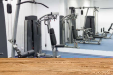 Empty wood table top on blurred abstract blur fitness gym background - filter color effect or display your products