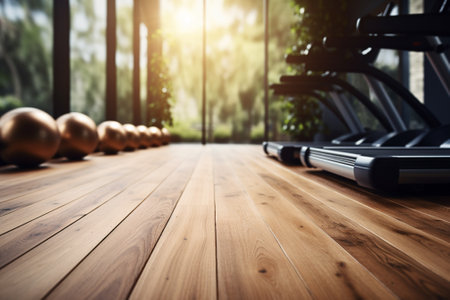 Wooden floor in a modern fitness club, blurred background with bokeh