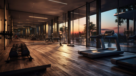 Stylish gym background, gym with exercise equipment without people, sunrise or sunset in the gym ai generative