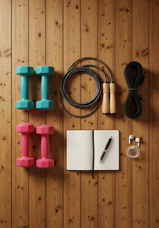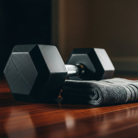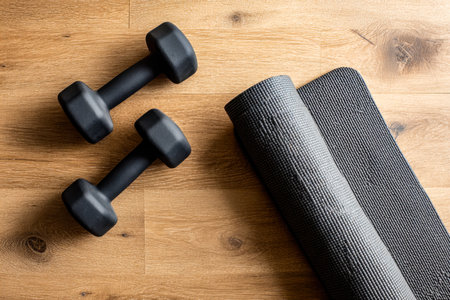 A cozy workout corner featuring a pair of dumbbells and a neatly rolled yoga mat on warm wooden flooring, inspiring balanced fitness sessions.