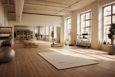 Minimalistic yoga studio interior with mats on floor, serene and stylish space for yoga practice