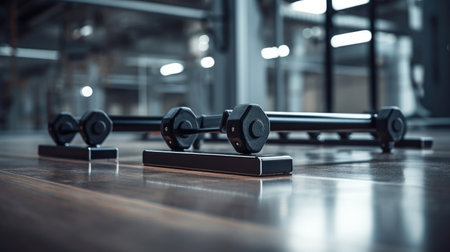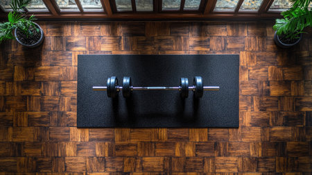 A pair of minimalist dumbbells rests on a textured wooden floor, showcasing diagonal patterns and ample negative space for a modern feel.