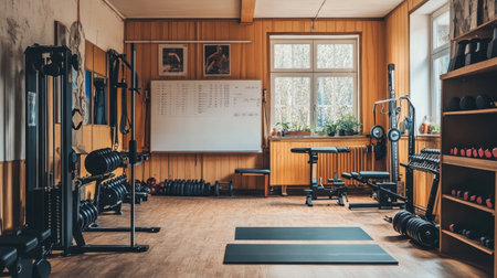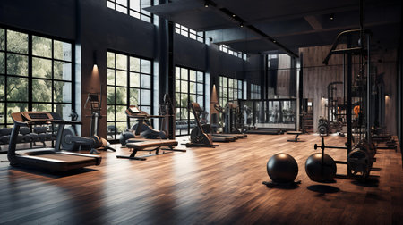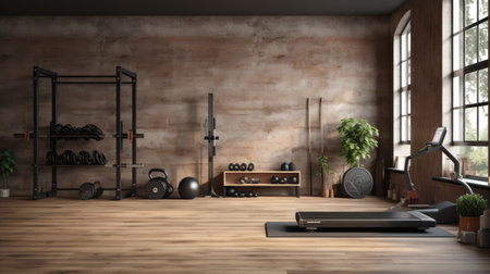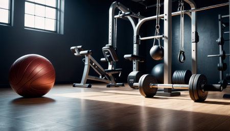 A well-equipped modern gym with various training equipment, including weights and a medicine ball, ready for a fitness regimen.. AI Generation