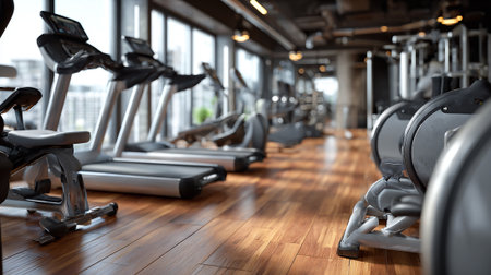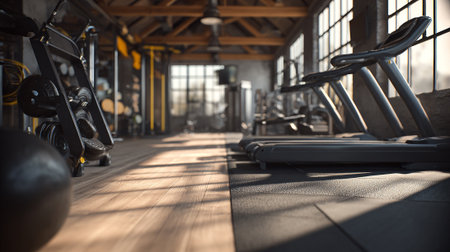 realistic fitness center with captivating distance blur and bokeh, setting the stage for a transformative workout experience