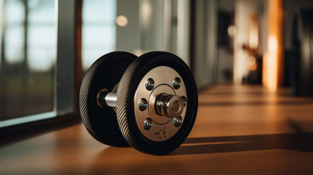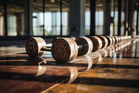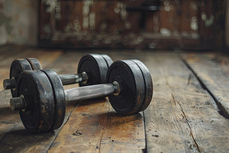 Rustic Dumbbells on Wooden Floor: Vintage Workout Equipment in Natural Light