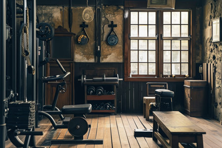 This photo captures a gym featuring a bench, various exercise equipment, and a window, A gym with vintage workout equipment, AI Generated