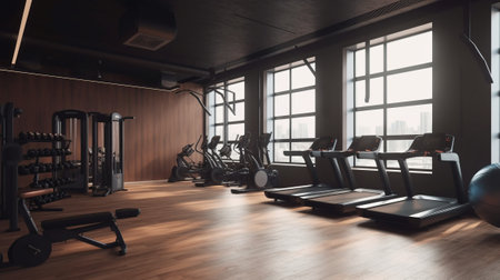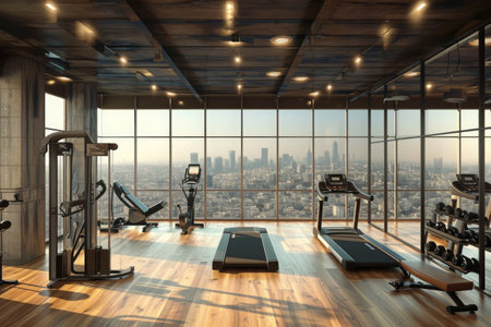 A gym overlooking the cityscape, offering a stunning view and a motivating environment for workouts, A panoramic view of a gym situated in the heart of a city, AI Generated