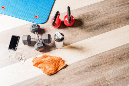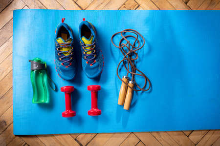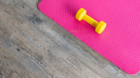 Fitness at home, equipment and tools for gym at home, dumbbell and mat in living room on wooden floor
