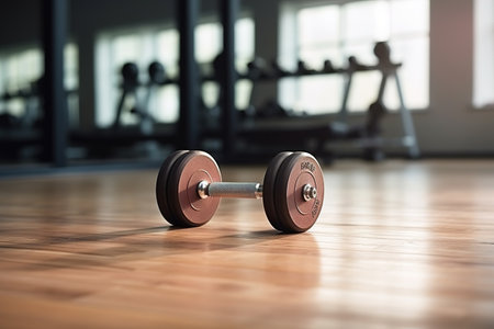Pair of dumbbells on a wooden floor in a gym. Great for fitness, workout, and exercise concepts