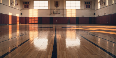 AI Generated. Empty gymnasium floor with polished wood reflecting minimal light during evening