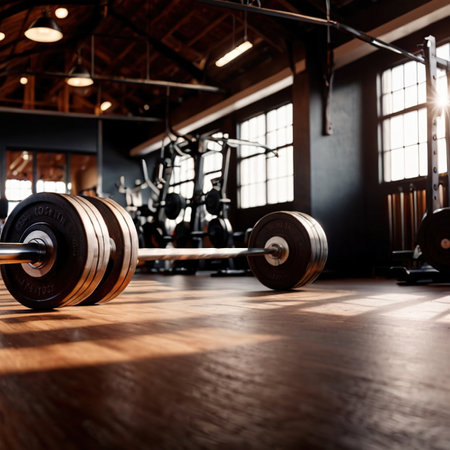 A barbell loaded with heavy plates rests on the gym floor, ready for weightlifting exercises, A barbell loaded with heavy plates on the floor