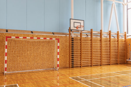 Indoor Sports Hall with Basketball Hoop and Soccer Goal in Gymnasium.