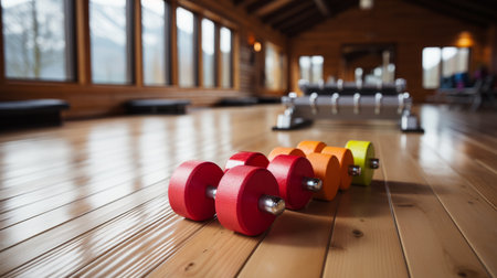 Colorful dumbbells in the gym with wooden floors and panoramic windows, no people