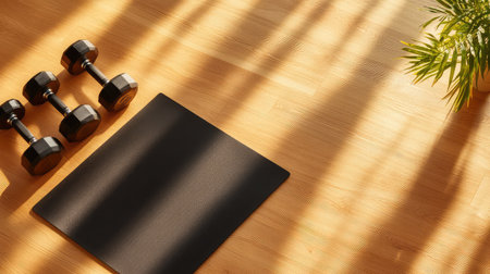 A serene home fitness setup featuring dumbbells and an exercise mat, illuminated by soft sunlight, creating an inviting atmosphere for workouts.