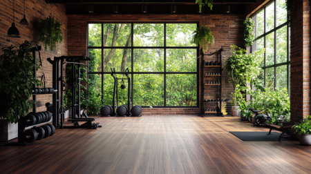 This modern gym interior features large windows that invite natural light, surrounded by vibrant greenery. A perfect space for fitness and wellness activities.