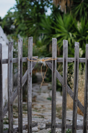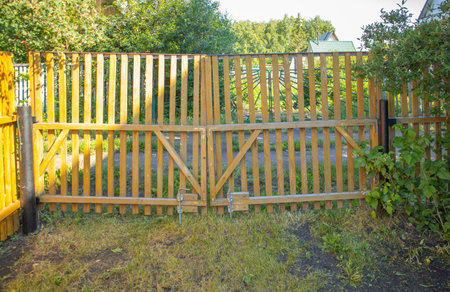 Close-up of a wooden picket fence gate in the backyard of a country house, a sunny summer day