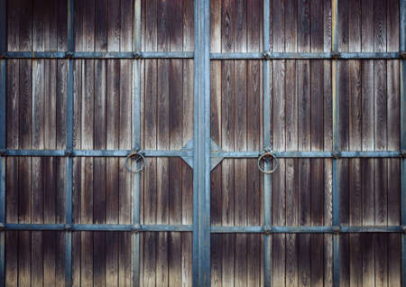 Closed vintage wooden gate with metal handles