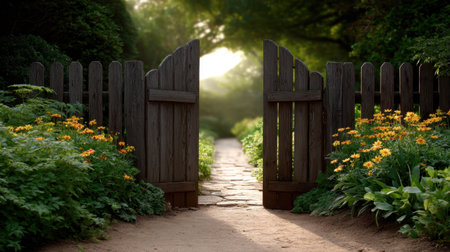 A picturesque scene featuring a wooden garden gate flanked by blooming yellow flowers, inviting visitors down a sunlit stone pathway through lush greenery.