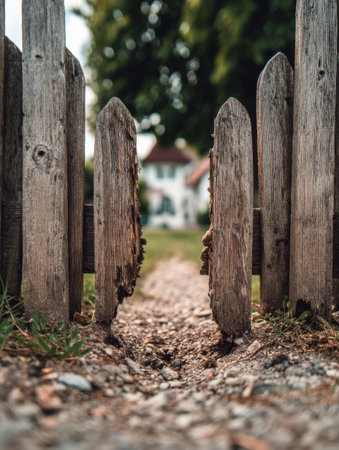 Looking through a weathered wooden fence, a gravel pathway leads to a lush garden surrounded by trees and a distant house visible in the background.