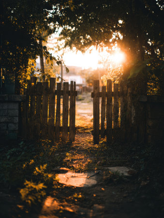 A charming wooden gate leads into a tranquil garden as the sun sets, casting warm light over the pathway and surrounding foliage.