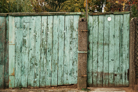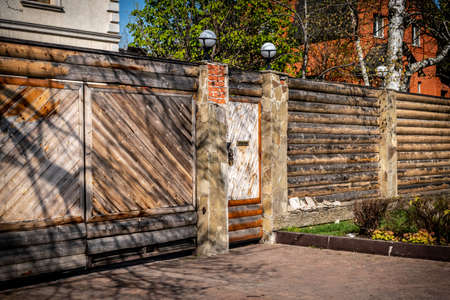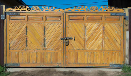 Closed wooden gate from the boards in the village or village. Vintage style design