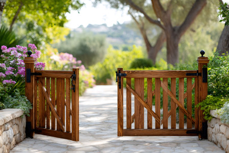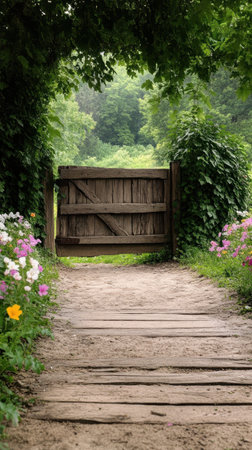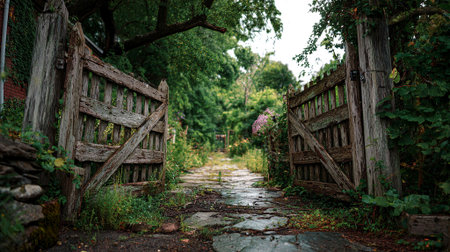 Weathered wooden gates lead to a peaceful stone path, bordered by rich greenery and colorful blooms, creating an inviting atmosphere for relaxation and exploration, AI generated