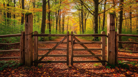 Old wooden gate opens to a path covered with colorful autumn leaves in a tranquil woodland setting