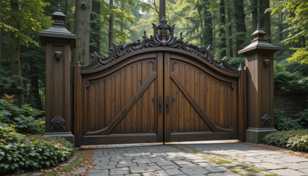 A grand wooden gate, adorned with ornate carvings, stands in a peaceful forest surrounded by tall trees and foliage.