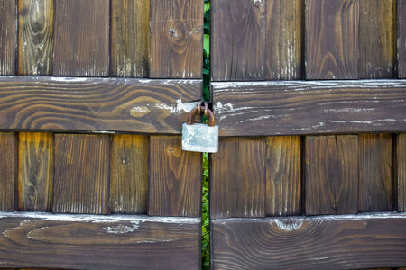 Old wooden gate closed with rusty padlock. Wood that has darkened with age. copyspace. selective focus.