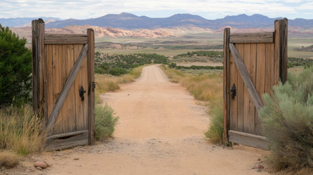 An inviting view through an open wooden gate leads to a dusty road, set against majestic mountains. This tranquil landscape captures the essence of rural beauty and exploration.