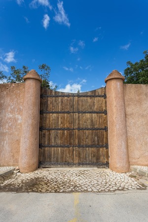 Detail of the wooden castle gate in arched shape in the evening.