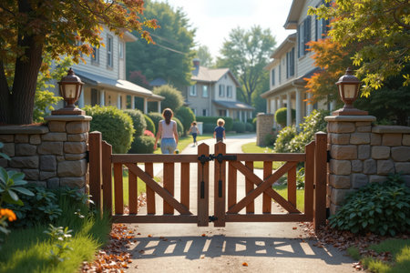 A wooden barrier gate blocking the entrance to a quiet residential neighborhood. The background features cozy houses with gardens and children playing on the street.