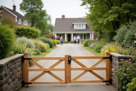A wooden barrier gate with a keypad at the entrance of a quiet cul-de-sac. The background shows well-kept gardens and neighbors chatting outside their homes.
