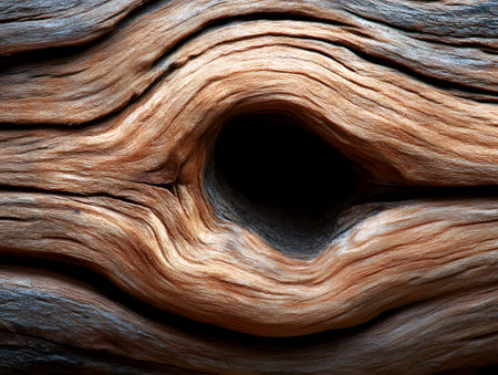 Explore the intricate details of aged wood featuring a central cavity and unique wavy grain patterns. This rustic texture evokes natural beauty and timeless appeal.