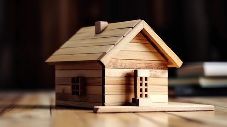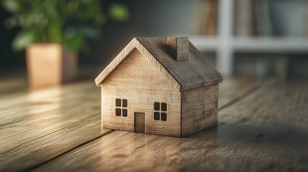 A small, white wooden house miniature rests on a textured wooden surface. The composition uses selective focus, highlighting the house against a blurred background. The warm tones and natural light suggest an indoor setting. Suitable for various conceptual and illustrative projects related to housing and real estate.