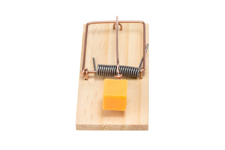 Mouse trap baited with a large piece of cheddar cheese. Top front view. Studio close-up isolated on a white background. Concepts could include risk, reward, danger, temptation, or others.
