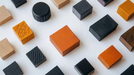 A captivating flat lay composition featuring colorful wooden blocks of different shapes and textures arranged on a white surface, showcasing artistry and design.
