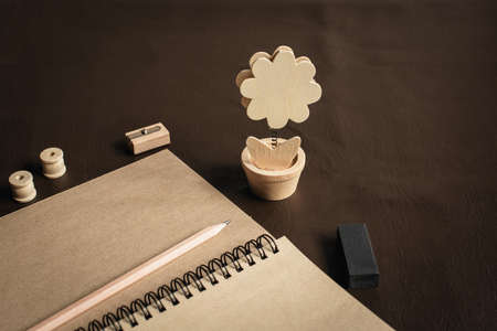 Tools writing on the table are brown notebook ,wood pencil,pencil sharpener and eraser.Mockup concept
