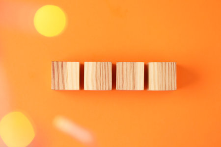 Blank wooden cubes on orange background, flat lay. Bokeh effect