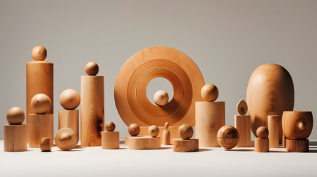 An overhead view displays wooden blocks artfully arranged in a curved formation. The blocks vary in their wood grain patterns and shades of brown. The composition appears against a soft, neutral-toned backdrop, with focused lighting. This image could suit conceptual design projects or commercial visuals.