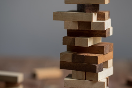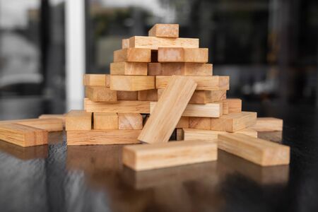 Blocks wood game with copy space, The tower from wooden blocks from the top view, Jenga, Businessman manage his strategy, Concept of education, risk, development, and growth